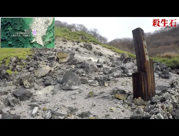 九尾の狐伝説のある殺生石。付近一帯に火山性ガスが噴出し、昔の人々が「生き物を殺す石」だと信じたこと…