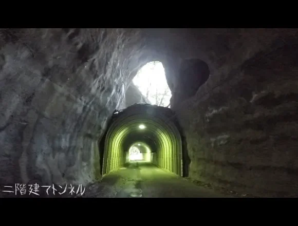 向山・共栄トンネル(二階建てトンネル)は全長約110mの素掘りのトンネルで、上…