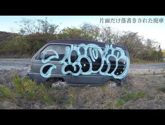 片面だけ落書きされた軽バンの廃車があったので探ってみました。なぜ片面だけなのだ…