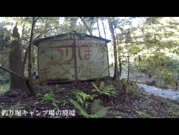 川の向こうに、つりぼりという文字が見えたのでその場所に行ってみたらどうやら釣り堀の廃墟だったみたい…