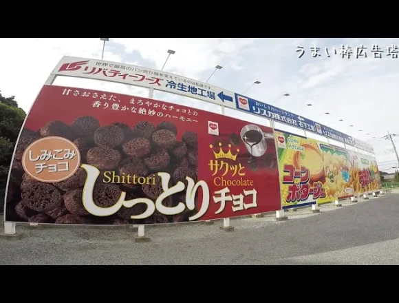 うまい棒広告塔という表示の場所に、巨大なお菓子の看板があります。それはこの近くにリスカ株式会社があ…