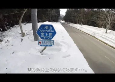 豪雪地帯にある2メートル以上はある雪の壁の上を歩いてみます。道路標識がガッ…