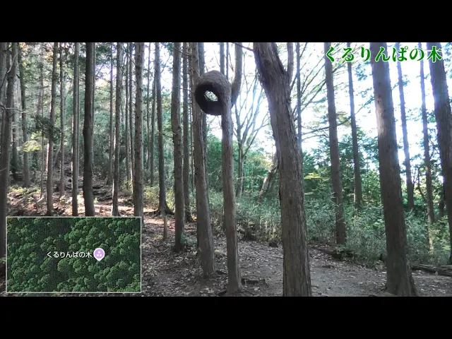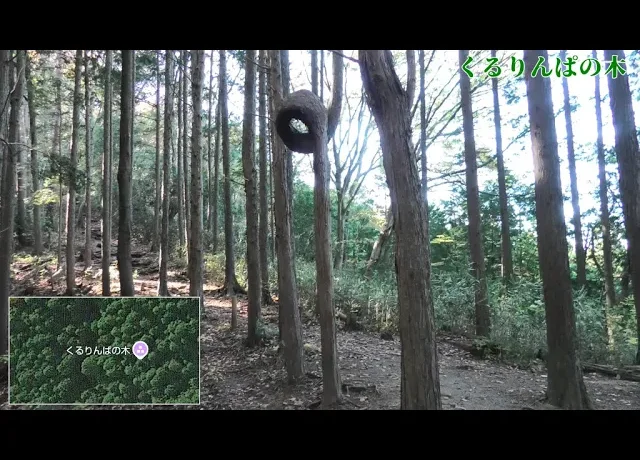 森の中にあるくるりんぱの木に行ってみます。しかし不思議な形をした木です。地図の表示とは違う場所にあり少々迷いましたが辿り着くことができました。