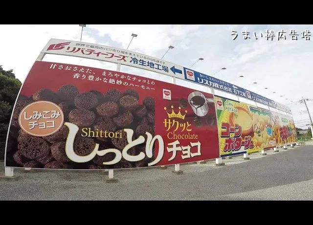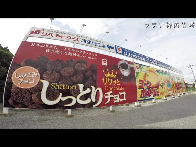 うまい棒広告塔という表示の場所に、巨大なお菓子の看板があります。それはこの近くにリスカ株式会社があるからなのです。かなり目立ちます!場所:茨城県つくば市