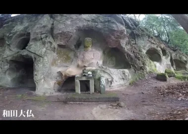 岩壁に彫られた磨崖仏と約20基の横穴墓群。磨崖仏は高さ約3.6m、弘法大師…