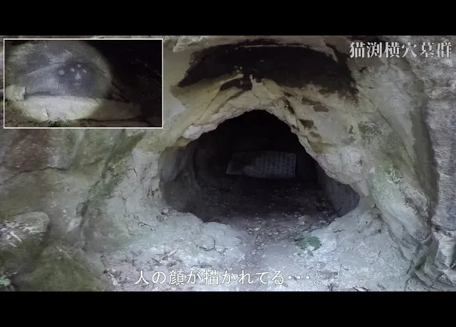 横穴群の中の一つに不気味な人物が描かれた壁画があります。奥壁には人面・魚、側壁には両手に剣を持つ人物の上半身が描かれてるようです。場所:茨城県常陸太田市高柿町