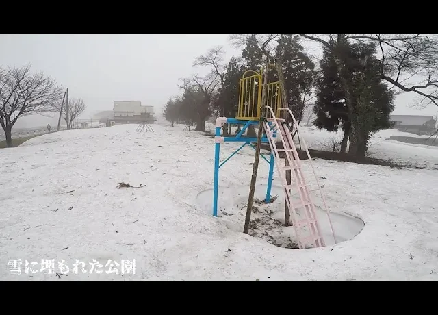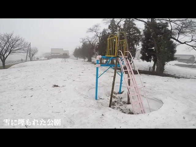 豪雪地帯にある雪に埋もれた公園を歩いてみます。公園遊具が半分以上埋まってます。場所:福島県只見町