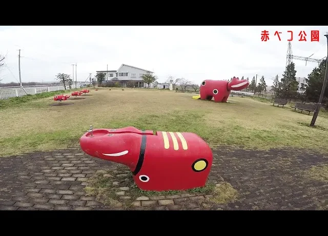 会津の伝統工芸品「赤べこ」が遊具で遊べる赤ベコ公園。ここには日本一大きい赤べこがあるようです。場所:福島県会津若松市神指町