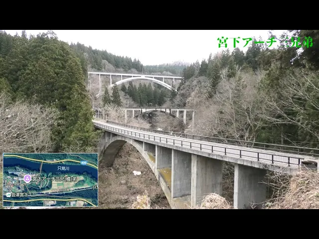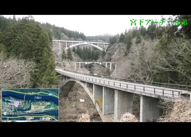 三つのアーチ橋を同時に見ることが出来るのは国内でも珍しいらしいです。・一番上の橋は、三男:国道252号 ・真ん中の橋は、長男:JR只見線・一番下の橋は、二男:県道237号場所:福島県大沼郡三島町宮下