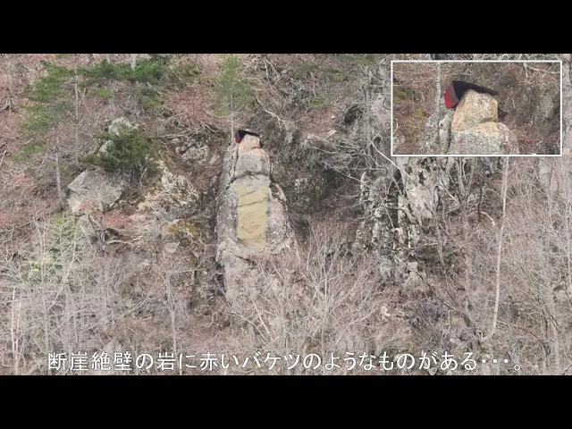 断崖絶壁の岩の上に赤いバケツのようなものが見えるけど何だろう?地蔵岩という看板があるけど関係がある?場所:福島県金山町