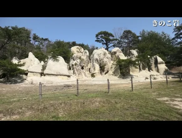 浄土松公園には断層で分断された地層が風化突出した「きのこ岩」と呼ばれる白亜の奇岩があります。福島の…