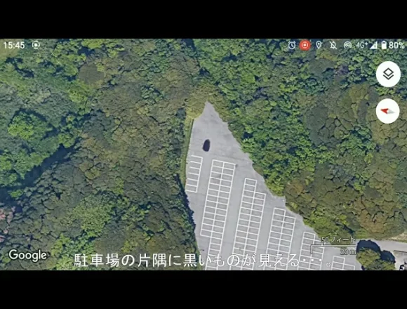 地図で見つけた駐車場の片隅にある黒いものの場所に行ってみます。これはなんなのか?画像クリッ…