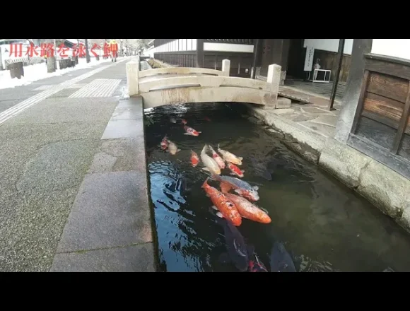 用水路を泳ぐ鯉の群れが珍しいんです。町全体では人口を超える鯉が泳いでるそう。戦時食として水路で鯉の…