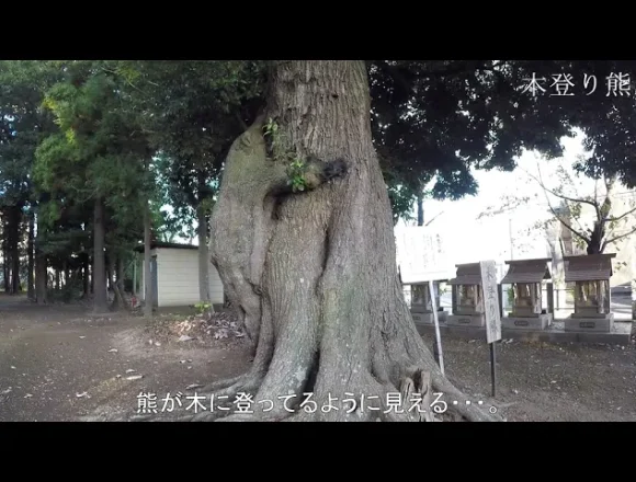 クマが登ってるように見える木があるという静神社にいってみました。境内に立つ大木の膨らみがそう見える…