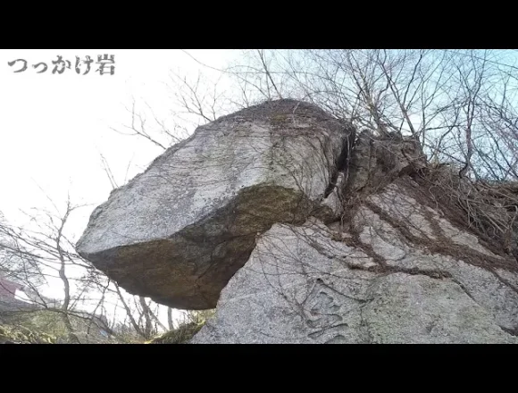 天狗が途中で疲れ果てこの場所に石をつっかけたという伝説があるようです。石の上部には天狗の鼻で擦れた…