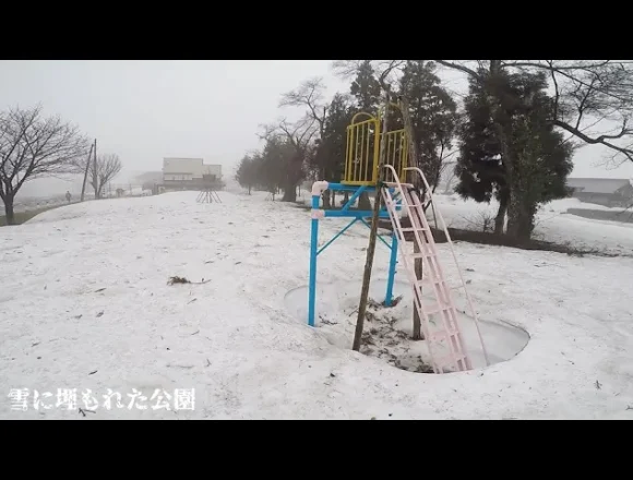 豪雪地帯にある雪に埋もれた公園を歩いてみます。公園遊具が半分以上埋まってます。場所:福島県只見町…